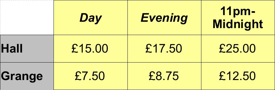 We have different rates for daytime hirers and evening hirers (after 6pm). We also have a premium rate for any booking that uses the building between 11.00pm and midnight. All events have to finish before midnight.